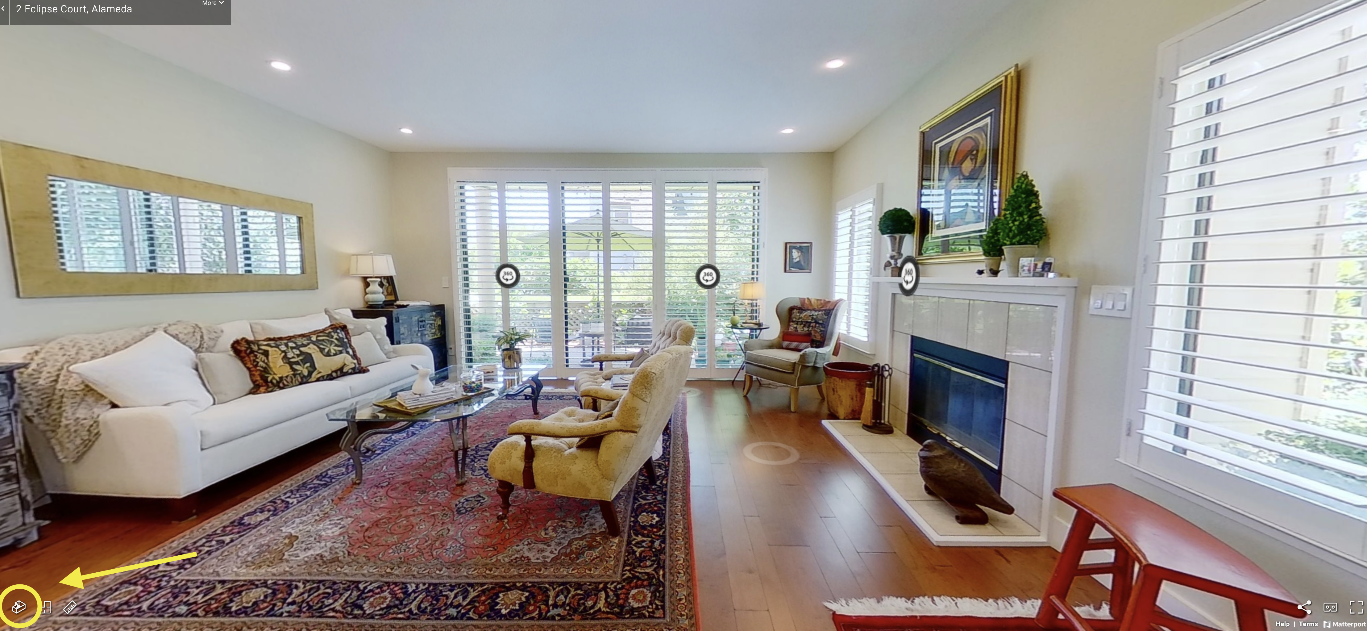 Wait for it to zoom inside the house, and then click on this little icon in the lower left, you'll be zoomed back out. This is called the Dollhouse View. You should see small white circles with photos inside. Click on these to view the 360-degree views, or "Outdoor Scans."